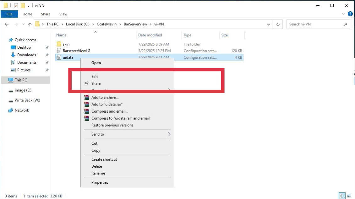 Bước 2: Xác định ngôn ngữ đang sử dụng. Ví dụ ở đây là Tiếng Việt, bạn bấm vào thư mục ngôn ngữ đó → sửa file uidta.